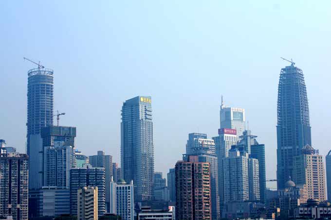 左邊高的是重慶賓館的C7022,封頂高度為290米,右邊高的是環(huán)球金融中心FO/23C,高度是260米,均為內(nèi)爬型式