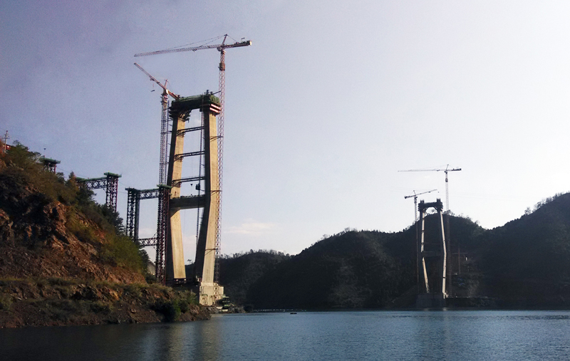 紅水河特大橋兩側(cè)橋墩高度均為210米,每個橋墩的起重機械配置均為川建生產(chǎn)的一臺C7036塔機、一臺C7030塔機和兩臺SC200/200WPZ中速變頻施工梯,副墩的施工機械為一臺P125平頭式塔機。 承擔主施工吊裝作業(yè)的C7036塔機,最大起重量16噸,工作幅度為70米,C7030塔機最大起重量16噸,起升高度為220米,工作幅度為50米,兩臺塔機交叉式布置,覆蓋面大,C7036塔身斷面2.5米,主弦為圓鋼,C7030塔身斷面2米,主弦為角鋼,機構(gòu)配置均采用變頻無級調(diào)速系統(tǒng),啟動、制動平穩(wěn)。