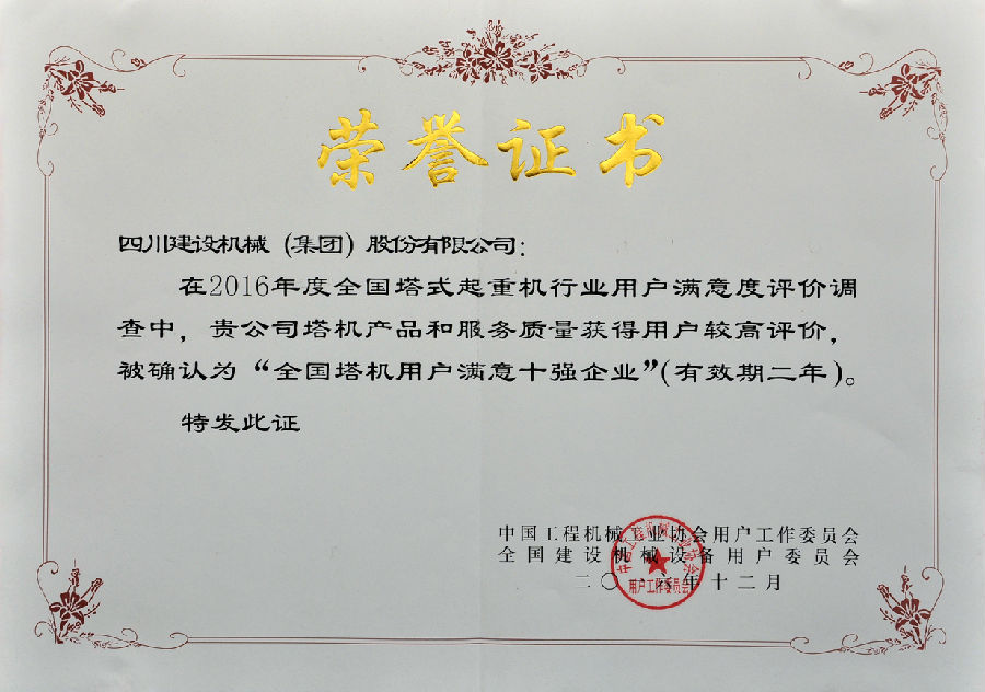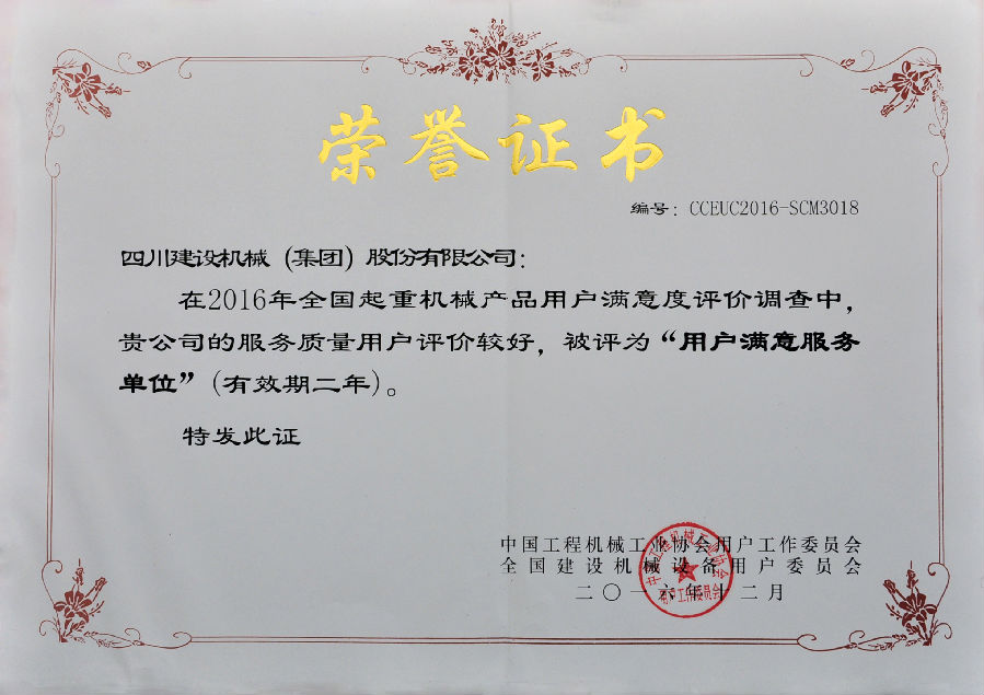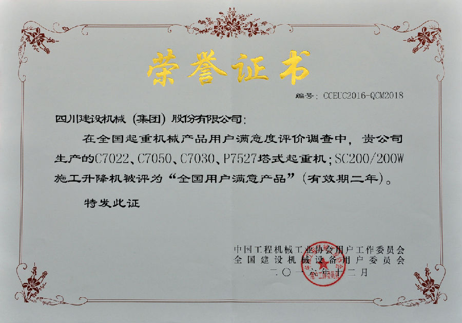 2016年全國用戶滿意產(chǎn)品評(píng)價(jià)測評(píng)結(jié)果公布,四川建設(shè)機(jī)械(集團(tuán))股份有限公司憑借良好的產(chǎn)品和服務(wù)質(zhì)量獲得全國用戶的較高評(píng)價(jià),榮獲了“全國塔機(jī)用戶滿意十強(qiáng)”企業(yè);獲得產(chǎn)品質(zhì)量調(diào)查連續(xù)十一次評(píng)價(jià)“全國用戶滿意”企業(yè);公司生產(chǎn)的C7022、C7050、C7030、P7527塔式起重機(jī)以及SC200/200W施工升降機(jī)被評(píng)為“全國用戶滿意產(chǎn)品”;同時(shí)獲得“用戶滿意服務(wù)”獎(jiǎng);1989年至今川建已連續(xù)十一次獲得全國用戶滿意獎(jiǎng),得到了業(yè)內(nèi)用戶的高度認(rèn)可。