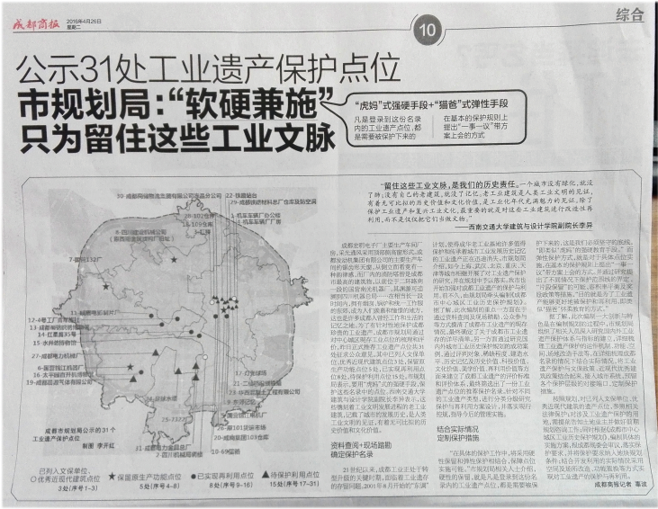 據(jù)成都商報(bào)2016年4月26日第十版訊,為了有針對性地保護(hù)成都珍貴的工業(yè)遺產(chǎn),成都市規(guī)劃局通過對中心城區(qū)現(xiàn)存工業(yè)點(diǎn)位的梳理和評價,規(guī)劃推薦工業(yè)遺產(chǎn)點(diǎn)位共31處,其中已列入文保單位、優(yōu)秀近現(xiàn)代建筑點(diǎn)位3處,保留原生產(chǎn)功能點(diǎn)位5處,已實(shí)現(xiàn)再利用點(diǎn)位8處,帶保護(hù)利用點(diǎn)位15處。