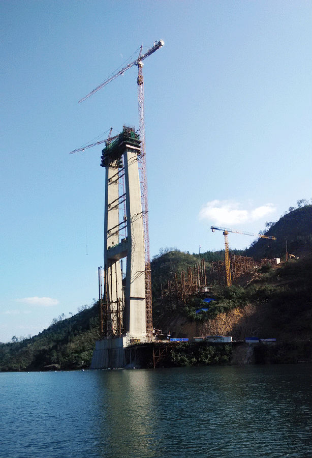紅水河特大橋兩側(cè)橋墩高度均為210米,每個(gè)橋墩的起重機(jī)械配置均為川建生產(chǎn)的一臺C7036塔機(jī)、一臺C7030塔機(jī)和兩臺SC200/200WPZ中速變頻施工梯,副墩的施工機(jī)械為一臺P125平頭式塔機(jī)。